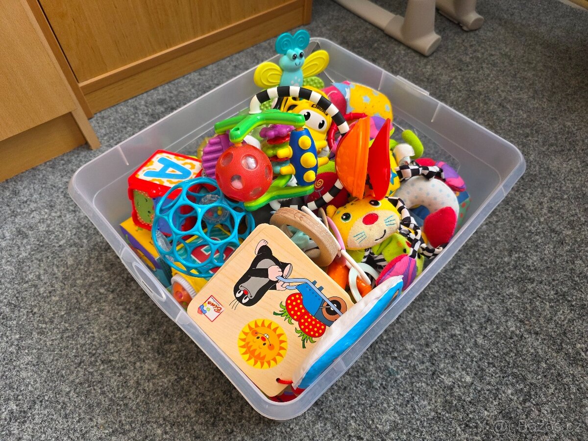 Prodám krabici hraček pro nejmenší. Různá chrastítka, kousátka, knížky, kostky... V top stavu. Cena za vše.