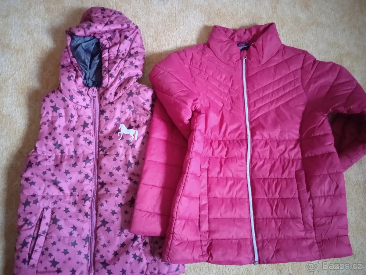Podzimní bunda růžová v.140, vesta v.116