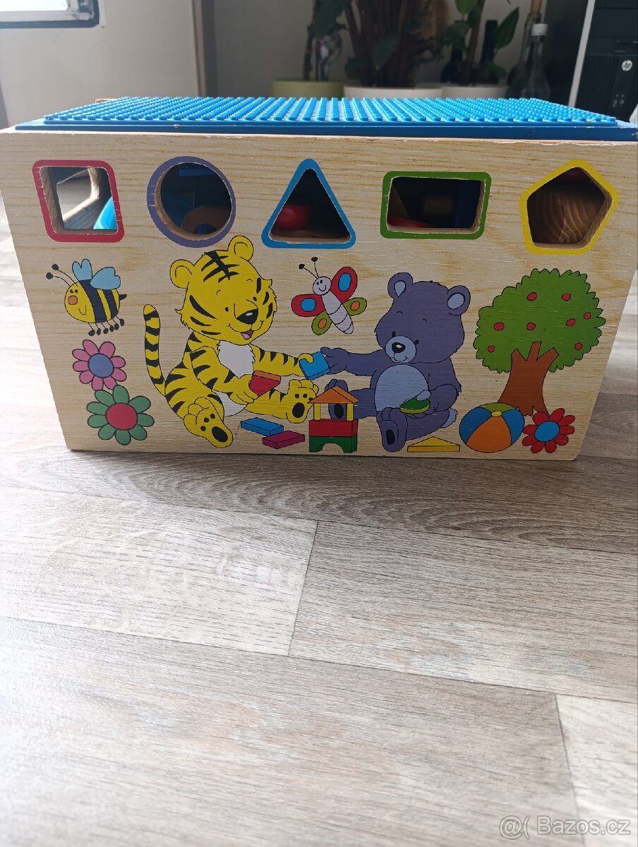 Dřevěná interaktivní krabice 6v1 z jedné strany se vkládají tvary,z druhé strany je tabule na křídy. Uvnitř kostky různých druhů a tvarů .