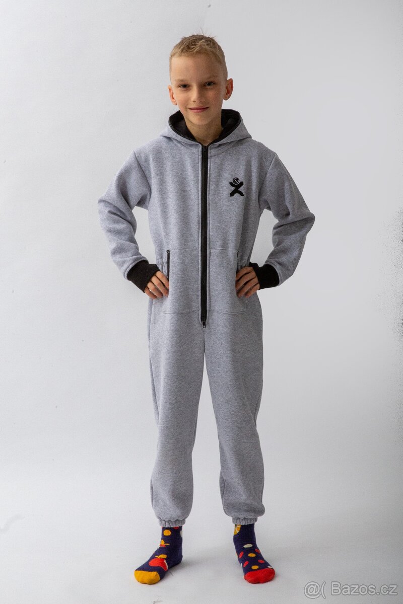 Dětský volnočasový overal s kapucí a oboustranně rozepínacím zipem. Overal je vhodný na každodenní domácí nošení i outdoorové aktivity. Jedná se o ruční výrobu z kvalitních bavlněných úpletů - počesané teplákoviny o složení 95% bavlny a 5% SPAN. Výhodou tohoto materiálu je nemačkavost, prodyšnost a schopnost odsávat vlhko. Rubovou stranu tvoří hebký hřejivý chloupek, který vyvolává příjemný pocit na kůži a to především u dětí a lidí s citlivou pokožkou. Dětské střihy jsou navrženy tak, aby zajistily volnost pohybu při všech aktivitách.