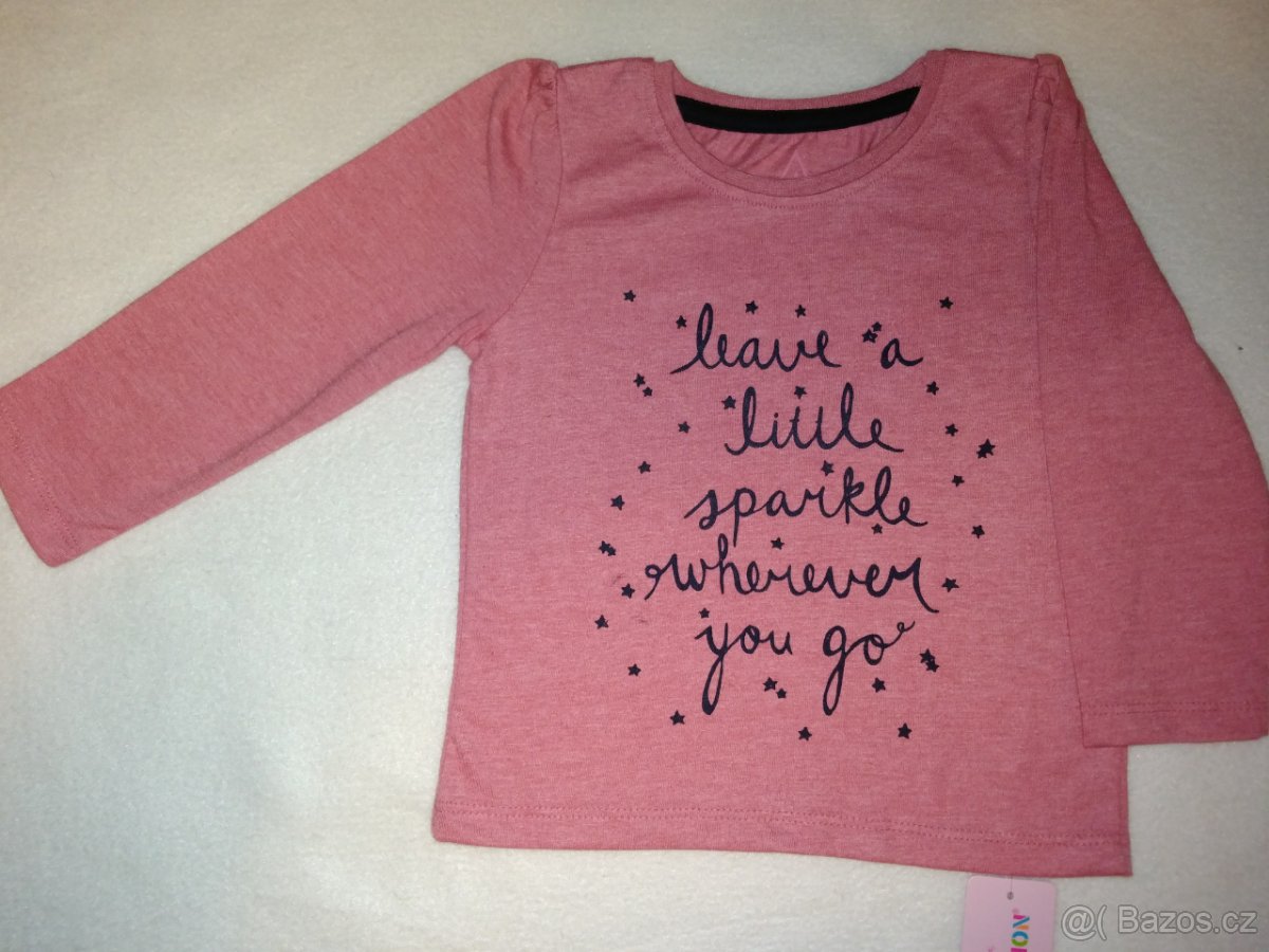 Dívčí starorůžové triko s nápisem a hvězdičkami v tmavě modré barvě. Velikost 86 (12-18m), značka Young Dimension (Primark), materiál je velmi příjemný 35% bavlna, 65% polyester. Triko je nové, nenošené, ještě má i cedulku z obchodu.