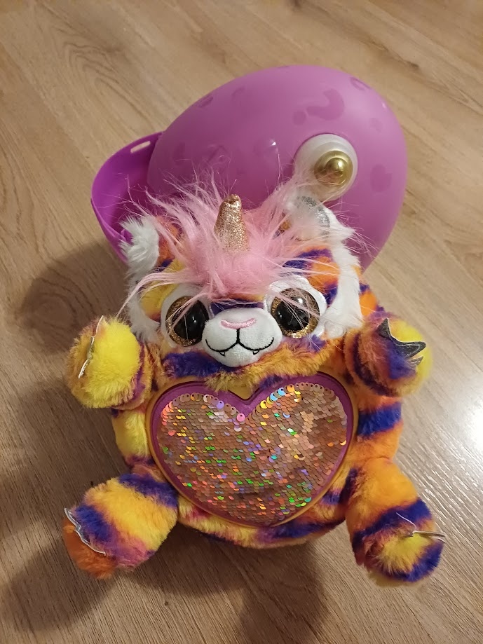 Vajíčko velké 29 cm, uvnitř schovaný plyšový tygr. Flitrové srdíčko lze z vajíčka oddělit a vložit tygrovi na bříško. Měnící flitry.