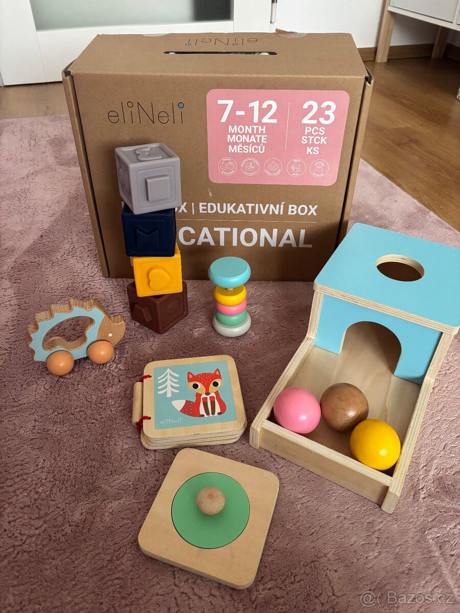Predám náš obľúbený Elis design edukatívny box pre miminka od 7-12 mesiacov, dcérka využila dlhšie. Malá vada na knižke a ježkovi (viď foto) - zohľadnené v cene,inak top stav.
