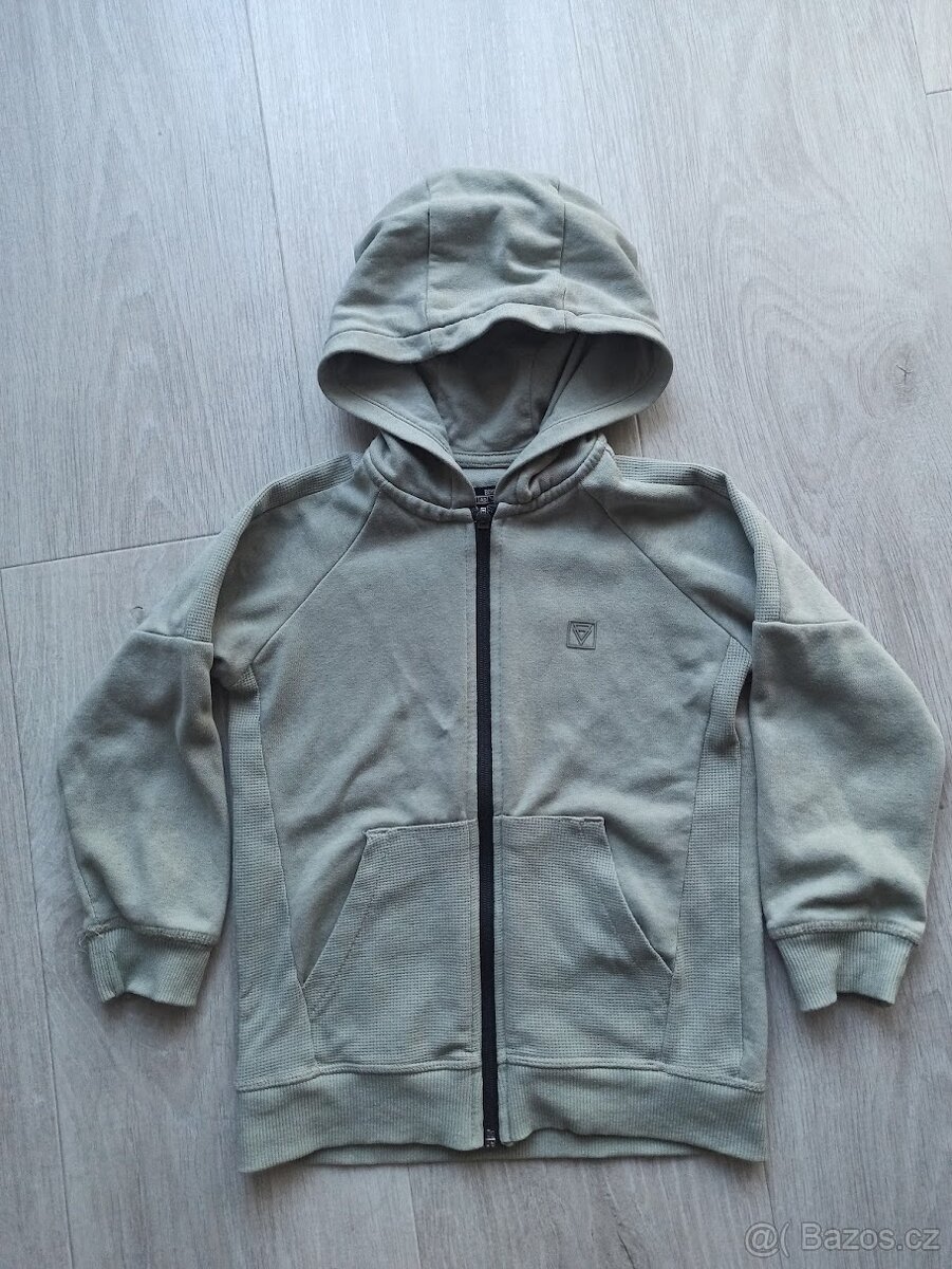 šedo tyrkysová propínací mikina s kapucí - vel. 110-116 - [8.2. 2026]Šedá mikina s tyrkysovým nápisem, propínací na zip, s kapucí a kapsami. Téměř nenošená, jako nová. Velikost 110 - 116.