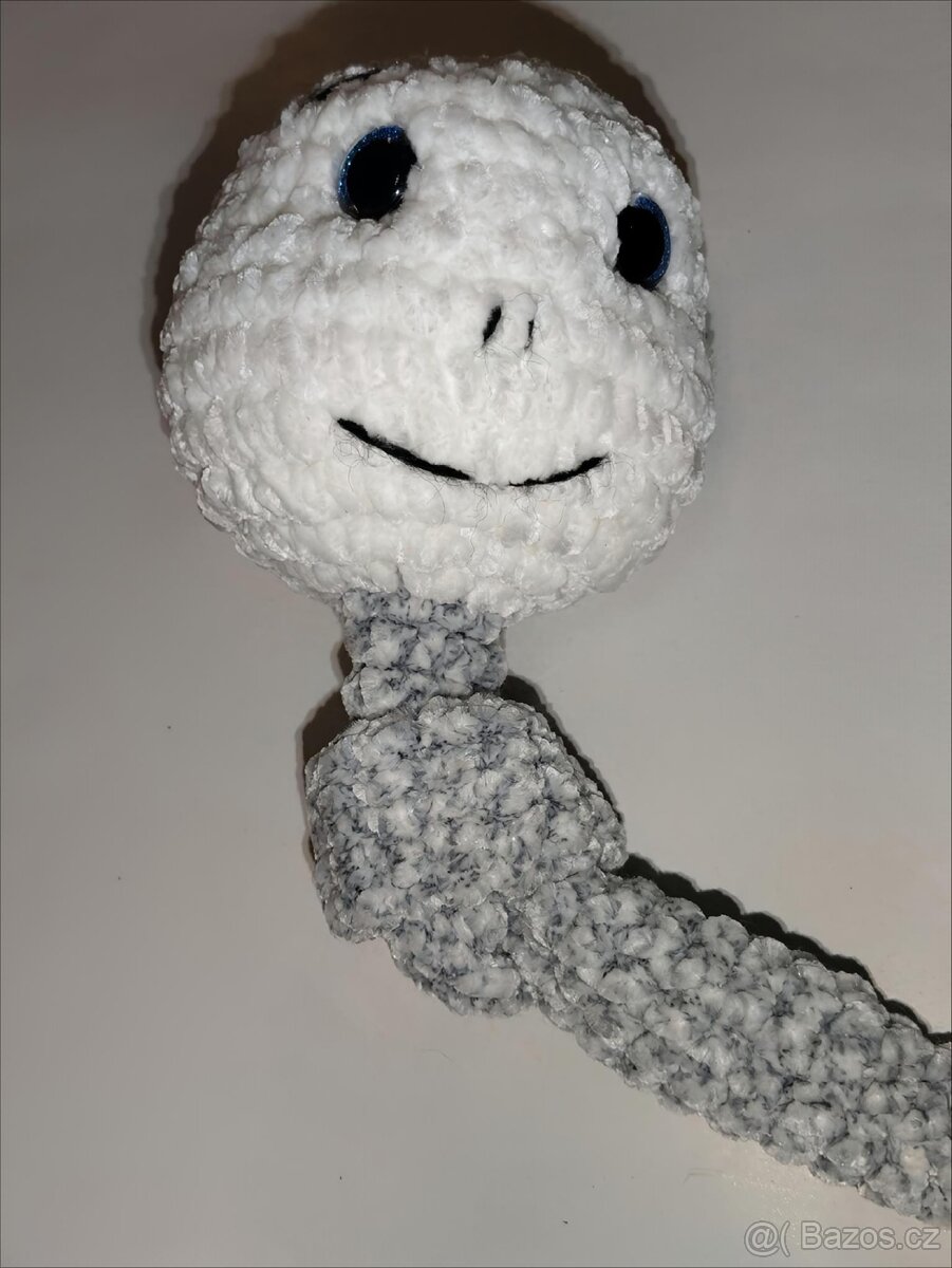Ručně háčkovaný plyšák ve tvaru červíka.