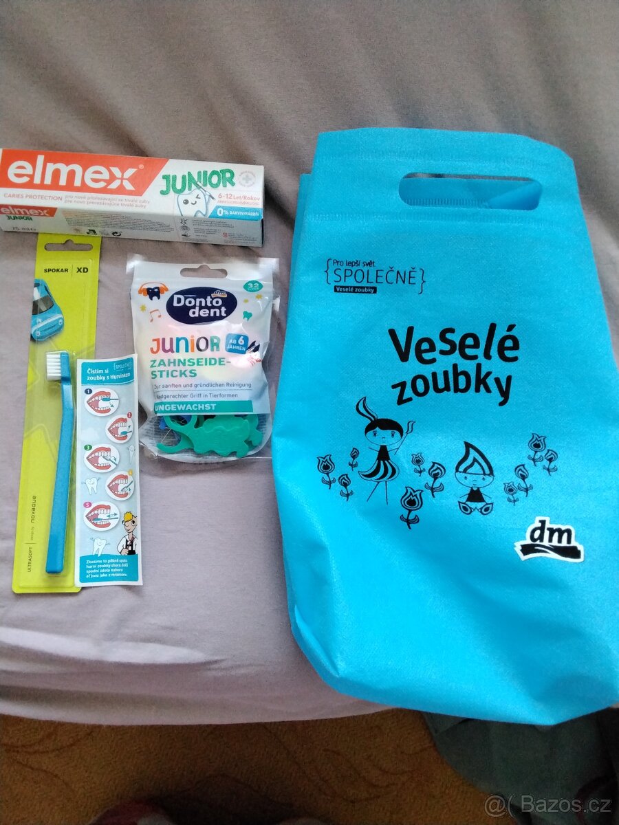 Veselé zoubky- obsahuje NALEPKU JAK SPRAVNE CISIT ZOUBKY S HURVINKEM,ZUBNI KARTACEK S JEMNYM VLÁKNEM, DETSKE MEZIZUBNI PÁRÁTKA 32KS A ELMEX JUNIOR PASTA 75ml A TO VSE V TAŠTIČCE.VHODNE PRO DITKO OD 6 ROKU.RADEJ PSAT A POUZE OSOBNI PREDANI