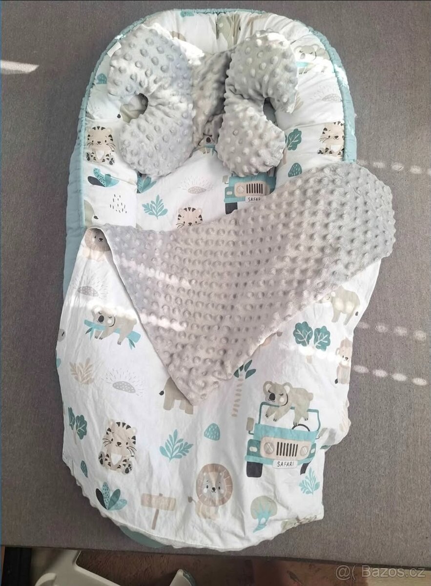 Součástí je hnízdo, zavinovačka, deka, polštářek, mantinel.