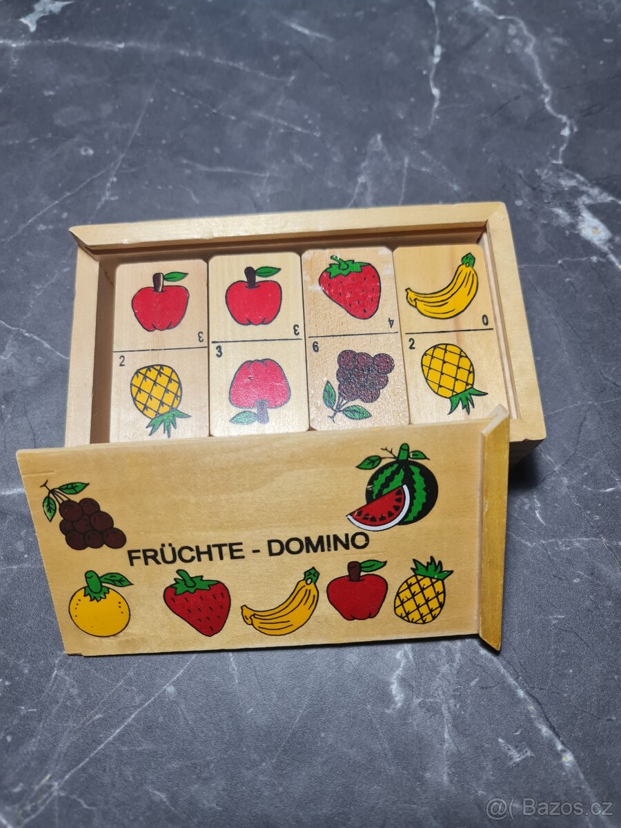 dětské dřevěné domino s motivem ovoce v dřevěné krabičce