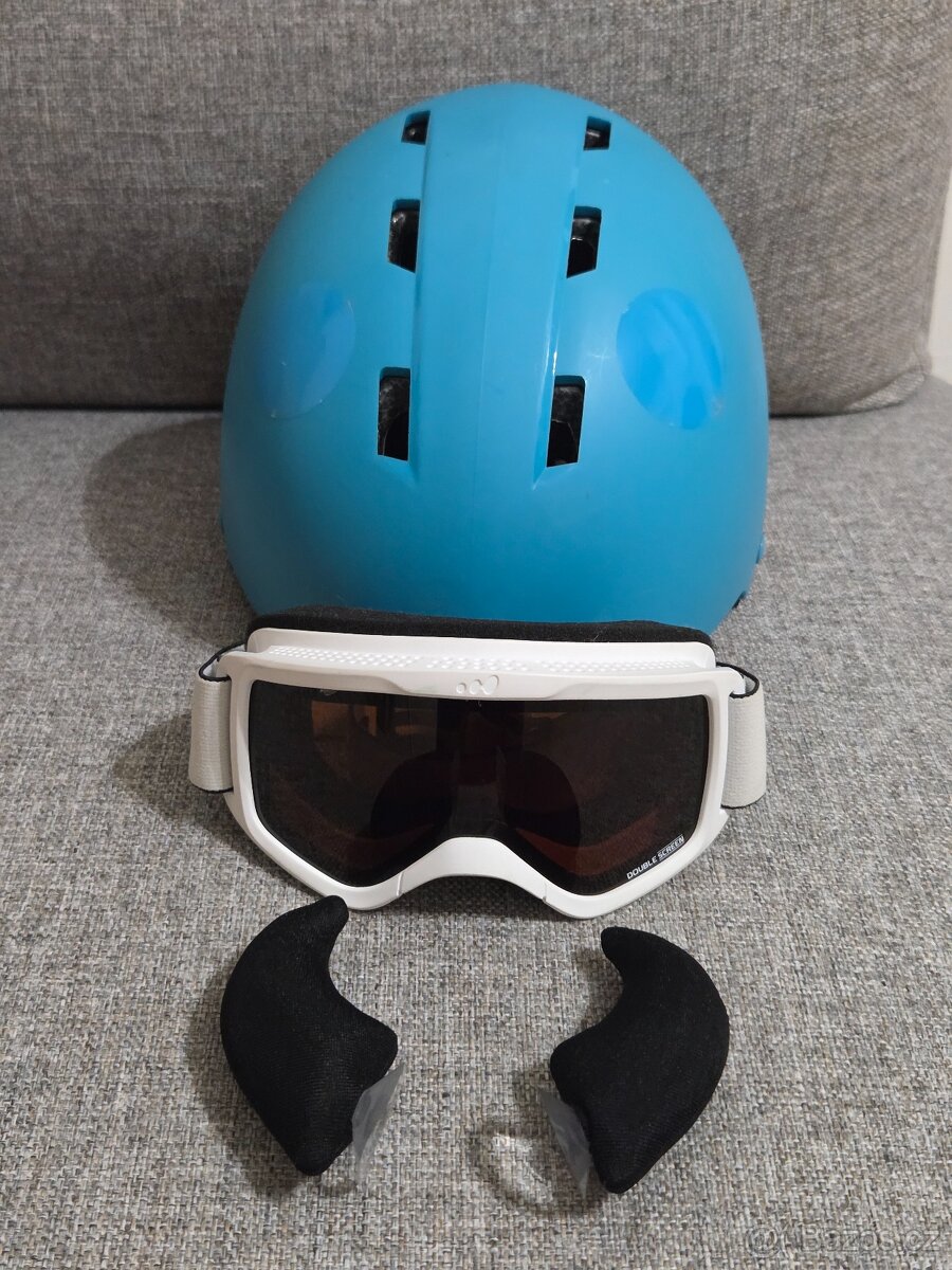 Prodám- v perfektním stavu, bez nehody,dětskou lyžařskou helmu zn.Wedze Decathlon, modrá barva, měkké polstrování, větrací otvory,nastavení obvodu kolečkem. K helmě růžky, padnoucí brýle.