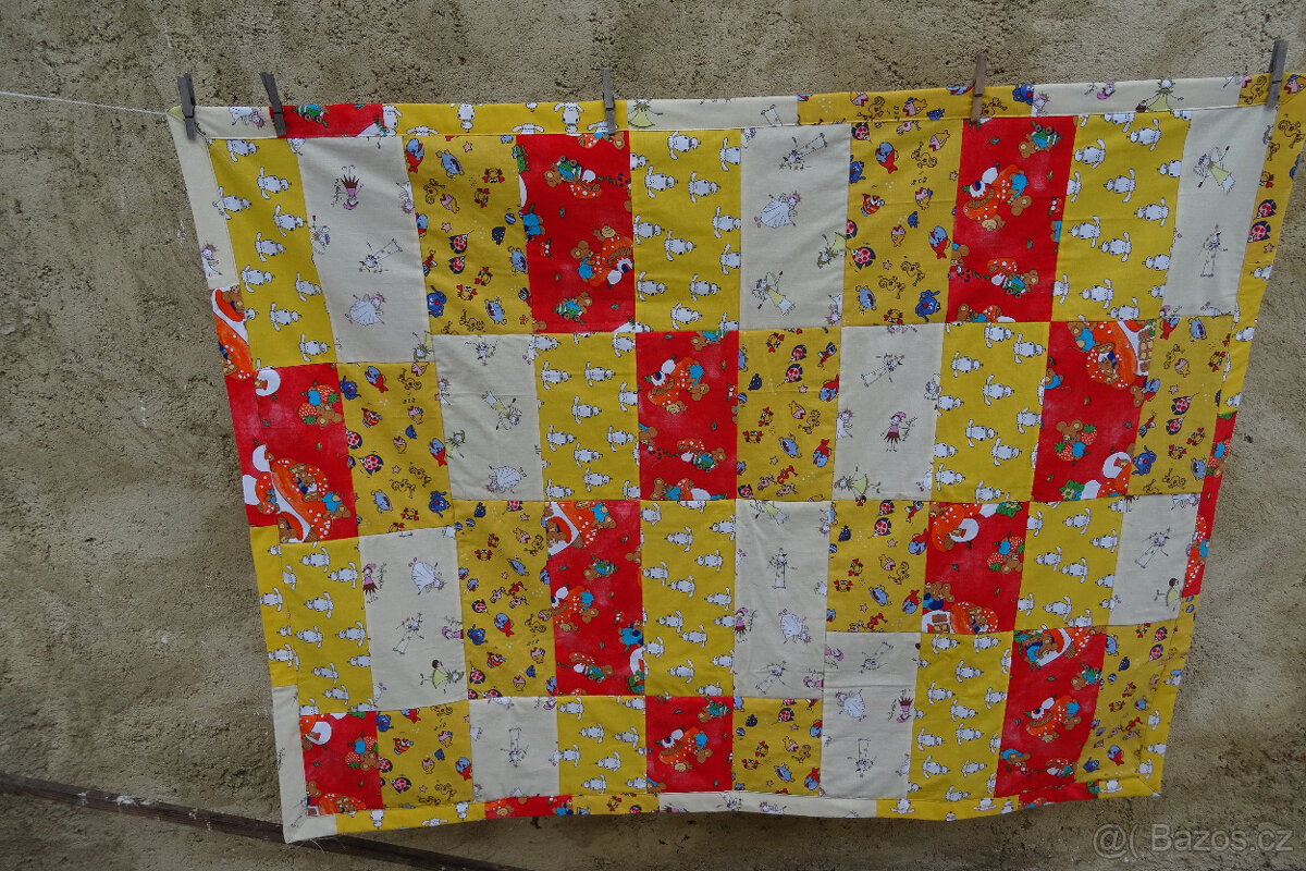 Deka je ušita z českých předem vysrážených látek. Jako výplň jsem použila fleece. Prošito ve větších čtvercích. Přikývka se může použít oboustranně. Možné prát v pračce na 40°C.