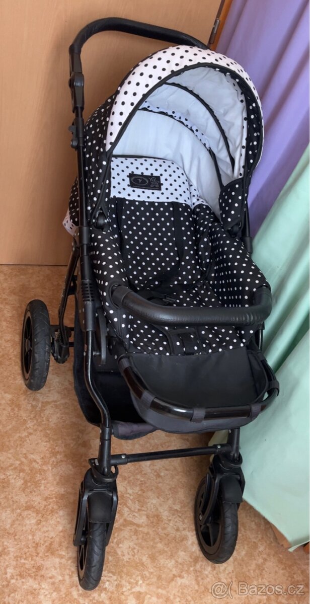 Hluboká korba s nánožníkem, autosedačka + vajíčko Maxi Cosi (včetně závěsné hračky Maxi Cosi a clony Dooky), pláštěnka. Podvozek v super stavu. Korbička je funkční, ale štít ...