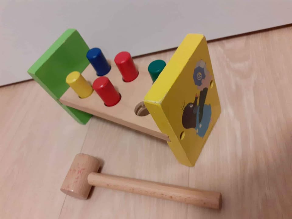 Dřevěné zatloukadlo krteček,pevné, funkční, schází jeden zatloukací kolík.