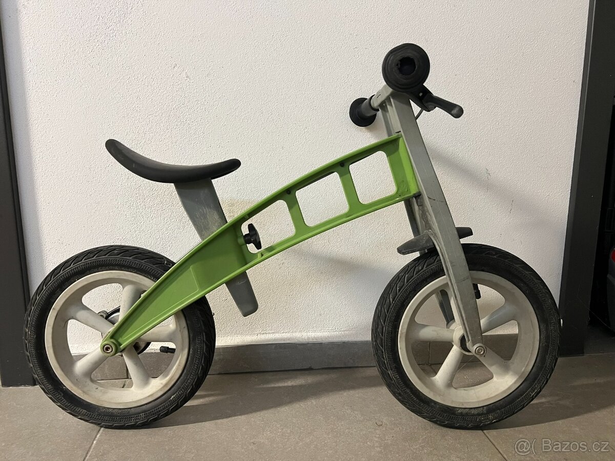 Firstbike, zelený, má STREET, silniční pláště vhodné do města. Verze s brzdou. Nastavitelná výška sedadla. Po dvou malých jezdcích. Nějaké šrámy, ale 100% funkčnost!