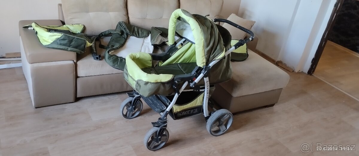 Prodám zelený kočárek - čtyřkombinace v dobrém stavu. Viz přiložené snímky. Uvedená cena je k jednání.