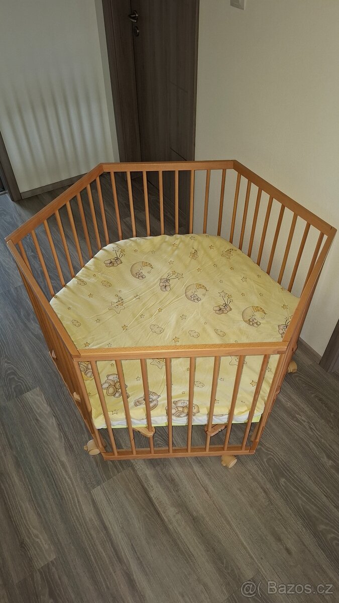 Dětská ohrádka šestirohá, barva natural. Největší vnitřní průměr 107 cm. Ohrádka je výškově nastavitelná, zabrzditelná kolečka. Součástí ohrádky je i polštář. (Litohoř)