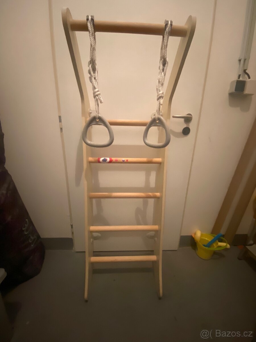 Prodám kvalitní dětskou gymnastickou žebřinu z masivního dřeva, která se připevňuje ke zdi. Součástí jsou gymnastické kruhy na pevných lanech.