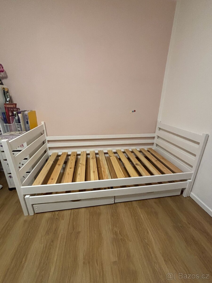Prakticky nová dětská postel, na které se spalo asi 3x. Součástí je druhé rozkládací lůžko + šuplíky = úložný prostor na lůžkoviny nebo na hračky. Dále je možnost využít jako základnu pro palandu, sloupky jsou navrtány a je tedy možnost nahoru přidat druhou postel. Vše prakticky jako nové, nyní v rozloženém stavu a zabaleno ve stretch folii. K dispozici ihned nebo po domluvě.