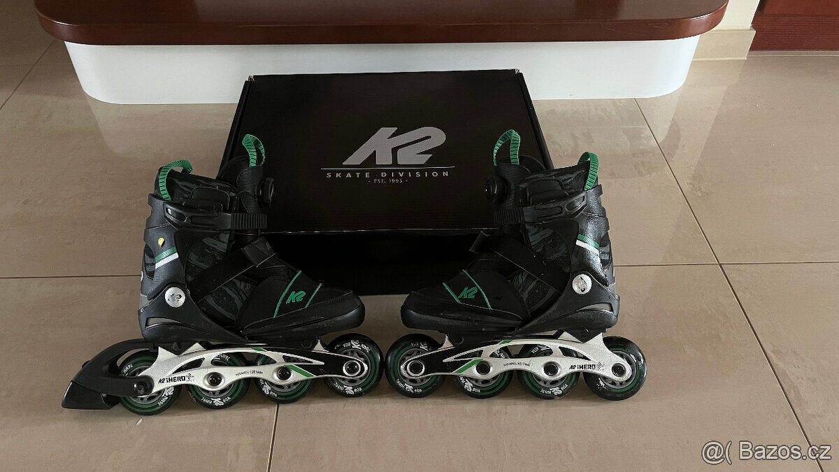 Prodám kvalitní dětské inline brusle černozelené barvy K2 SK8 Hero Boa Alu.Velikost 32-37, moc pěkný stav, málo používané.Syn je měl párkrát na noze.Prodávám včetně originál krabice.Vhodný dárek.