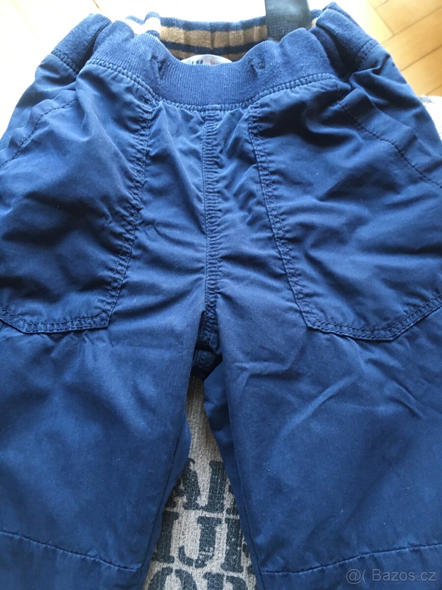 Kalhoty zn H&M, krasna tmave modra barva (fotografie jsou barevne hodne zkreslene). Vrchni marerial je bavlna s polyamidem, podsivka je bavlna s primesi viskozy. Kalhoty jsou v pase do gumy. Uvedena velikost je 128, ale podle meho jsou trochu mensi. Delka nohavic je 73 cm (od vrchni casti gumy v pase), od rozkroku je delka 51 cm. V pase v klidu cca 48-49 cm, v max natazeni 64-65 cm. U zadni kapsy byl kousek latky roztrzen. Je vyspraveno ozdobnym stehem, takze vubec nevadi. Zohledneno v cene.