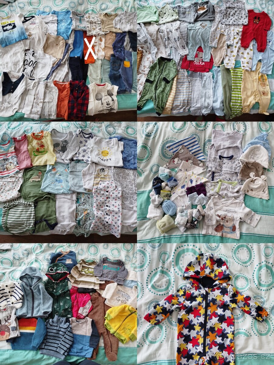 Obsahuje: body a trička dlouhý i krátký rukáv, kalhoty/tepláčky, mikiny, svetry, kabátky (žlutě lemovaný kabátek má lehce vytahaný spodní lem), polodupačky, pyžama (bez ťapek), přechodové overaly, softshellovou kombinézu, rukavičky (pro miminko), slintáčky, punčošky, ponožky, čepičky, dvě společenské košile. 🌺