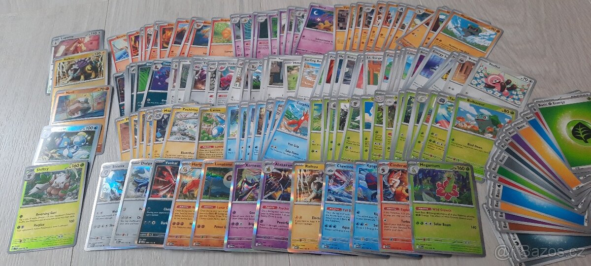 originál, karty by se neměly opakovat, slušný základ pro komplet základních karet, chybí asi jen 14 obyč., holo jsou všechny, obsahuje tedy asi 96 obyč.karet, 16 energií, lesklé 12 holo a jen 5 reverse, PPLbox 76 Kč