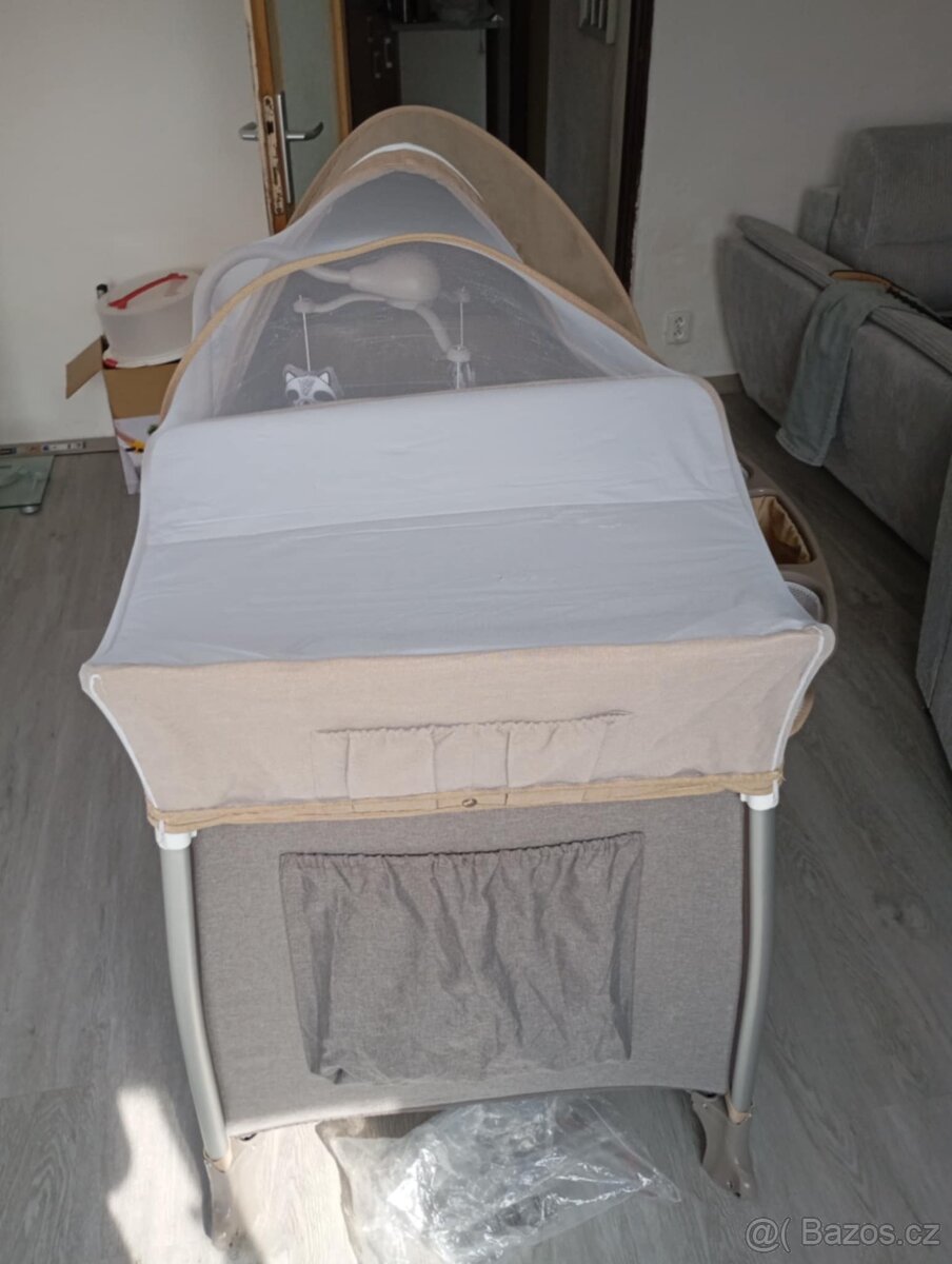 Postýlka + přislušenstvi - [5.1. 2026]Prodam postýlku+nebesa+zavinovačku+ povlečení+ mantinel+ hrací kolotoč nad postýlku+ sít na postýlku proti hmyzu