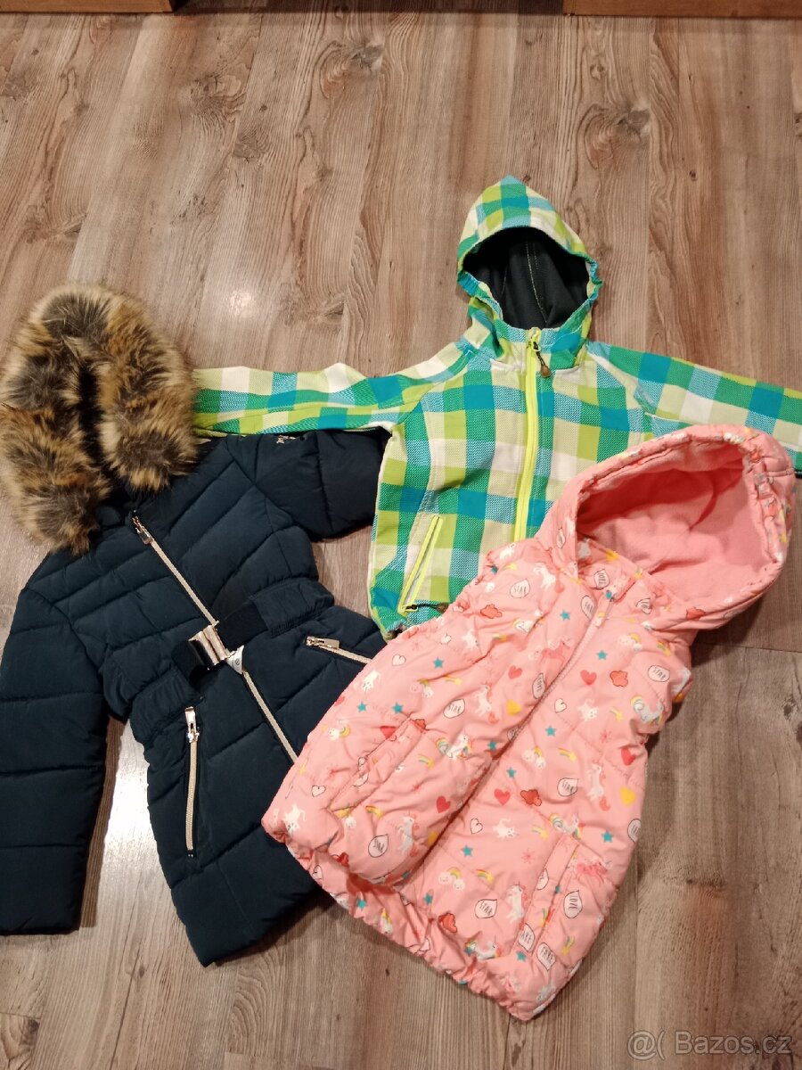 Modrý kabátek hodně teplý, kožešina kolem kapuce jde odepnout,kostkovaná softshellová, vesta má malou dírku na zádech viz foto.