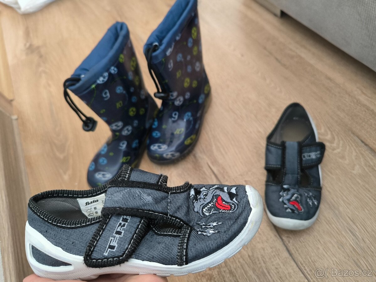 Dětské gumáky se stahovací šňůrkou vel. 28 a ve stejné velikosti přezůvky na suchý zip používané necelý rok ve školce. Jednotná cena 350 Kč i s dopravou.