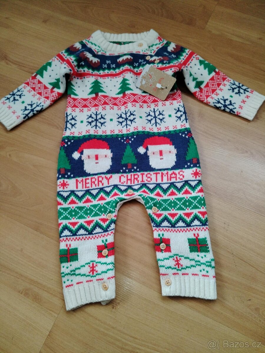 Vánoční overal vel. 80 - [4.1. 2026]Hezký teplý vánoční overal, 9 - 12 měsíců, protiskluzové podrážky. Délka 65 cm, šířka 30 cm, rukáv od krku 32 cm.
