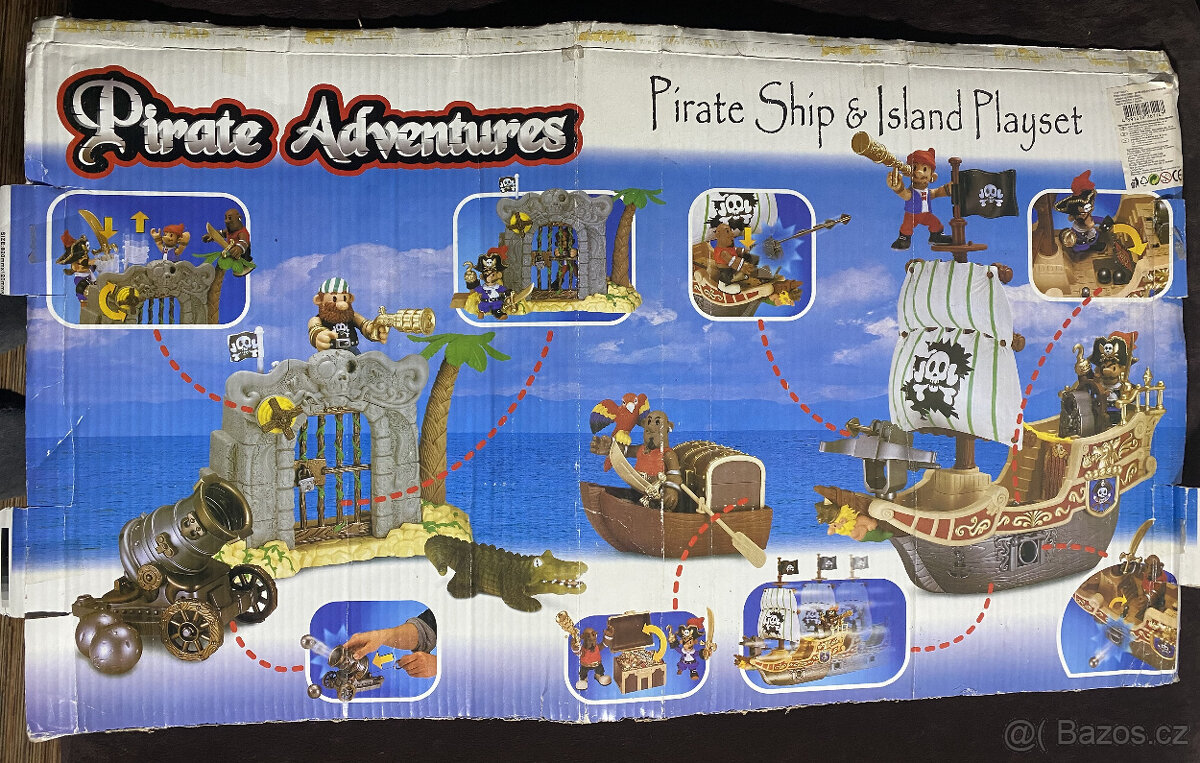 Hrací sada - pirátská loď, člun, vězení na ostrově-(vlajky nevyjíždějí otáčením kola), dělo-(jedno kolo se neotáčí), truhla s pokladem, piráti - pohyblivé ruce a nohy, papoušek, krokodýl