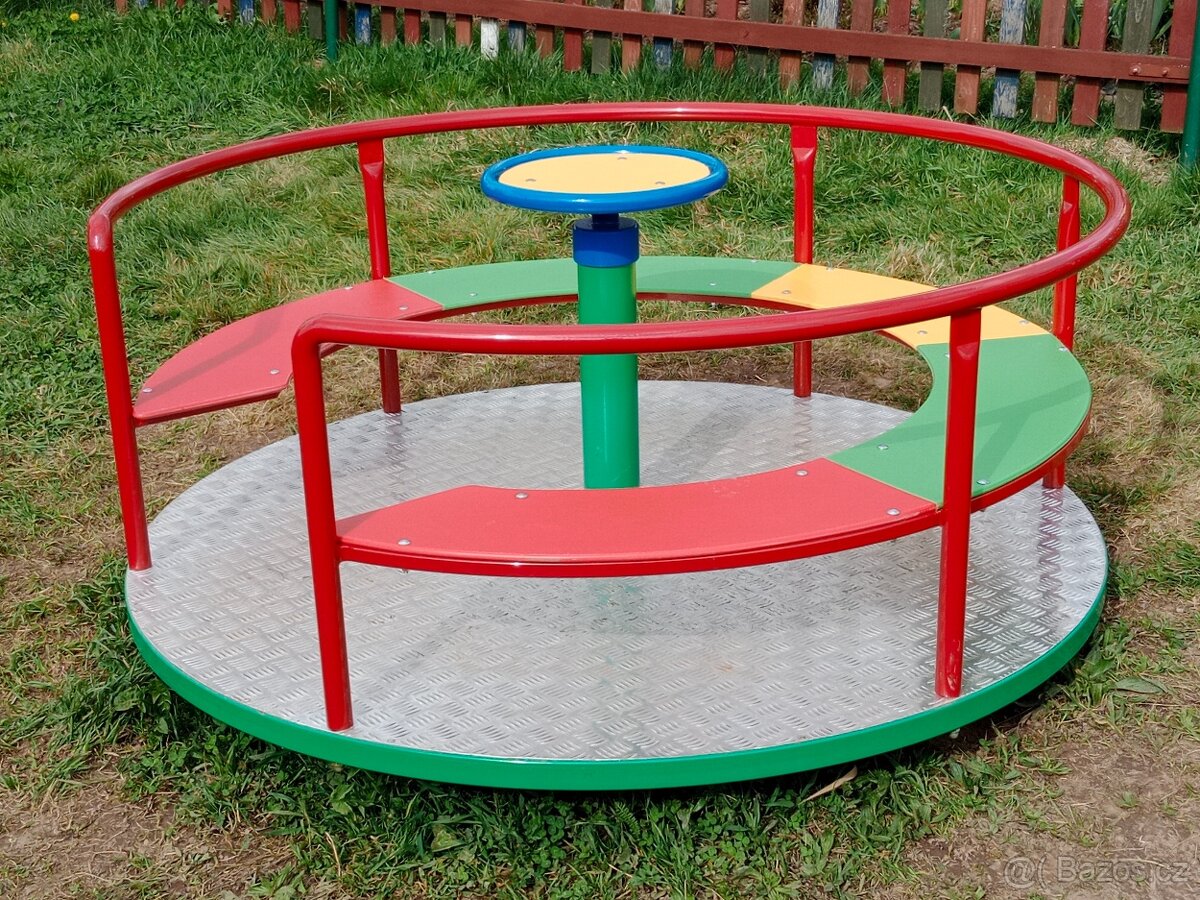 Dětský kolotoč na zahradu bez nutnosti betonáže do země. Je přenosný dle potřeby na jiné místo.