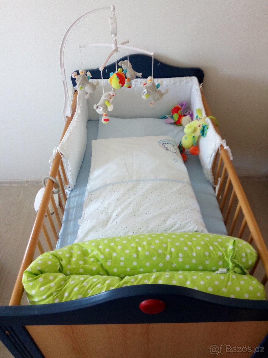 Prodám dětskou postýlku modré barvy. Rozměr 140 x 70 cm. Lze ji upravit na běžnou dětskou postel bez zábran. Součástí matrace, chránič matrace, 4x prostěradlo, 3x povlečení, zvýšený polštářek, peřinka + polštář. Pouze osobní odběr.