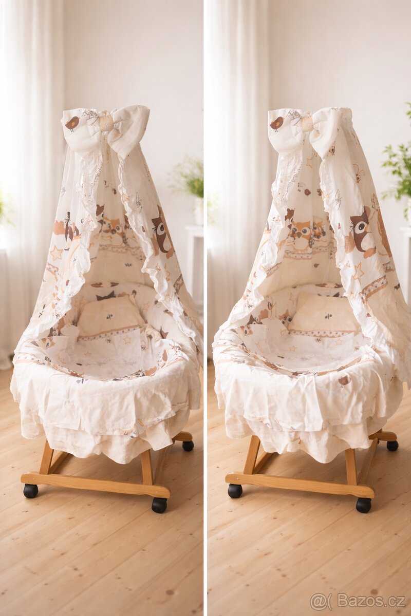 Součástí: košík, polstrování, polštářek, nebesa, dřevěný stojan na kolečkách.