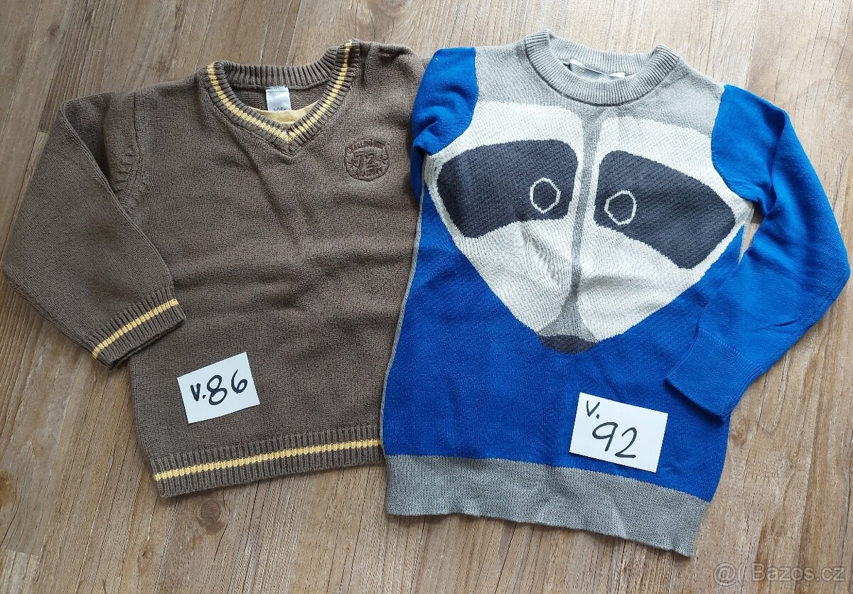 svetry, zimní čepice a rukavice, košile v. 92, rolák v. 104, funkční oblečení, trika DR, trika KR, pyžama, slipy, trenky, ponožky, bačkůrky, kalhoty, tílka d.44 cm, vesta, dětské roušky. Vše za Kč 300,-. jednotlivě dohodou. berunkainfo@seznam.cz
