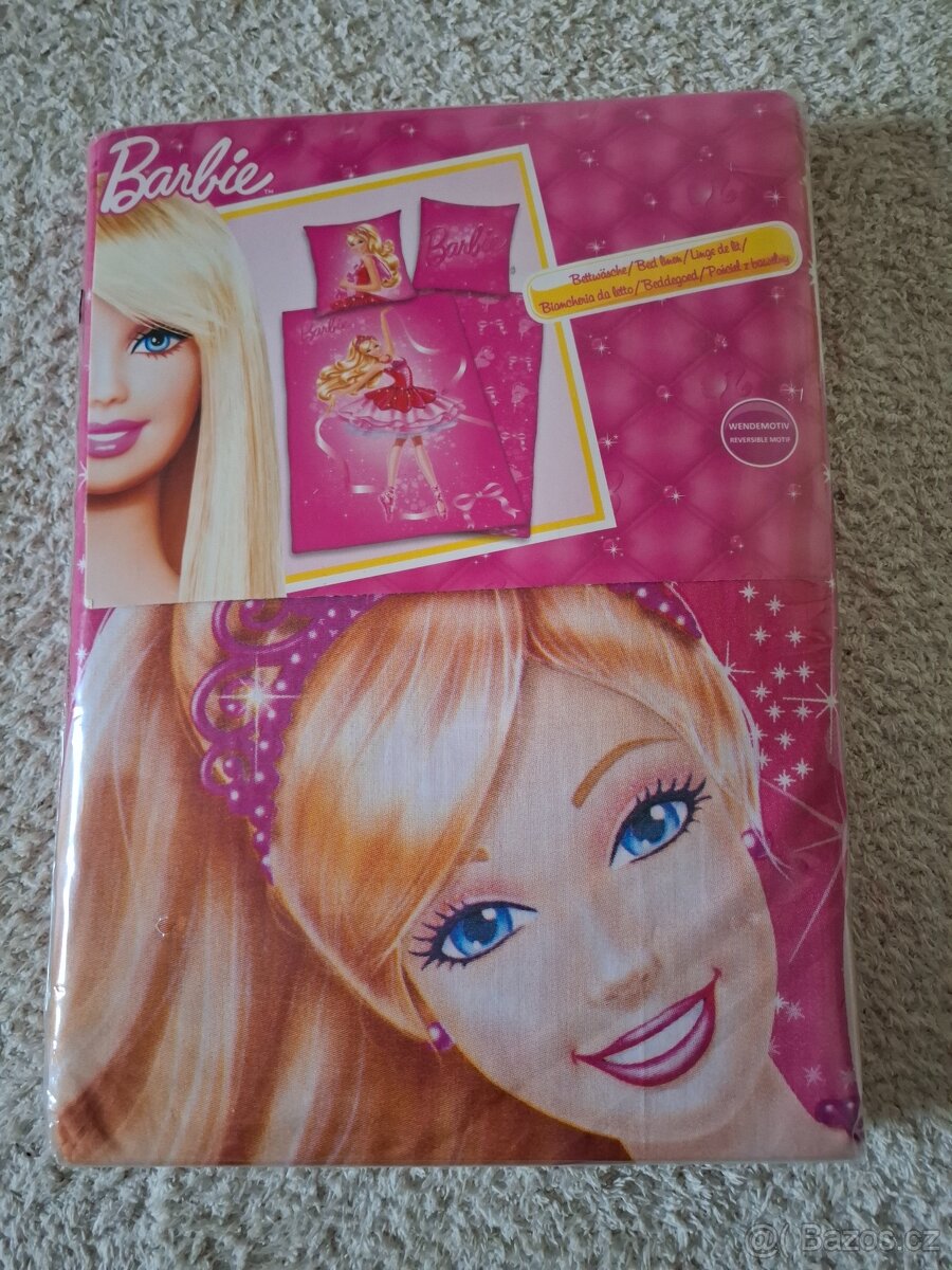 Prodám novou bavlněnou soupravu na 1 postel Barbie. Sada obsahuje 1x povlak na polštář 70x90 cm a 1x povlak na přikrývku 200x140 cm.