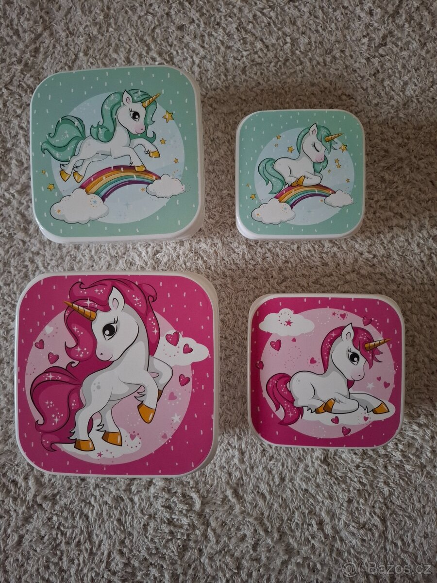 Prodám novou sadu čtyř plastových svačinových boxů s víčkem Jednorožci. Mají objem 300ml (9x9x4,5cm), 450ml (10,5x10,5x5cm), 650ml (12x12x5,5cm) a 1l (14x14x6cm).
