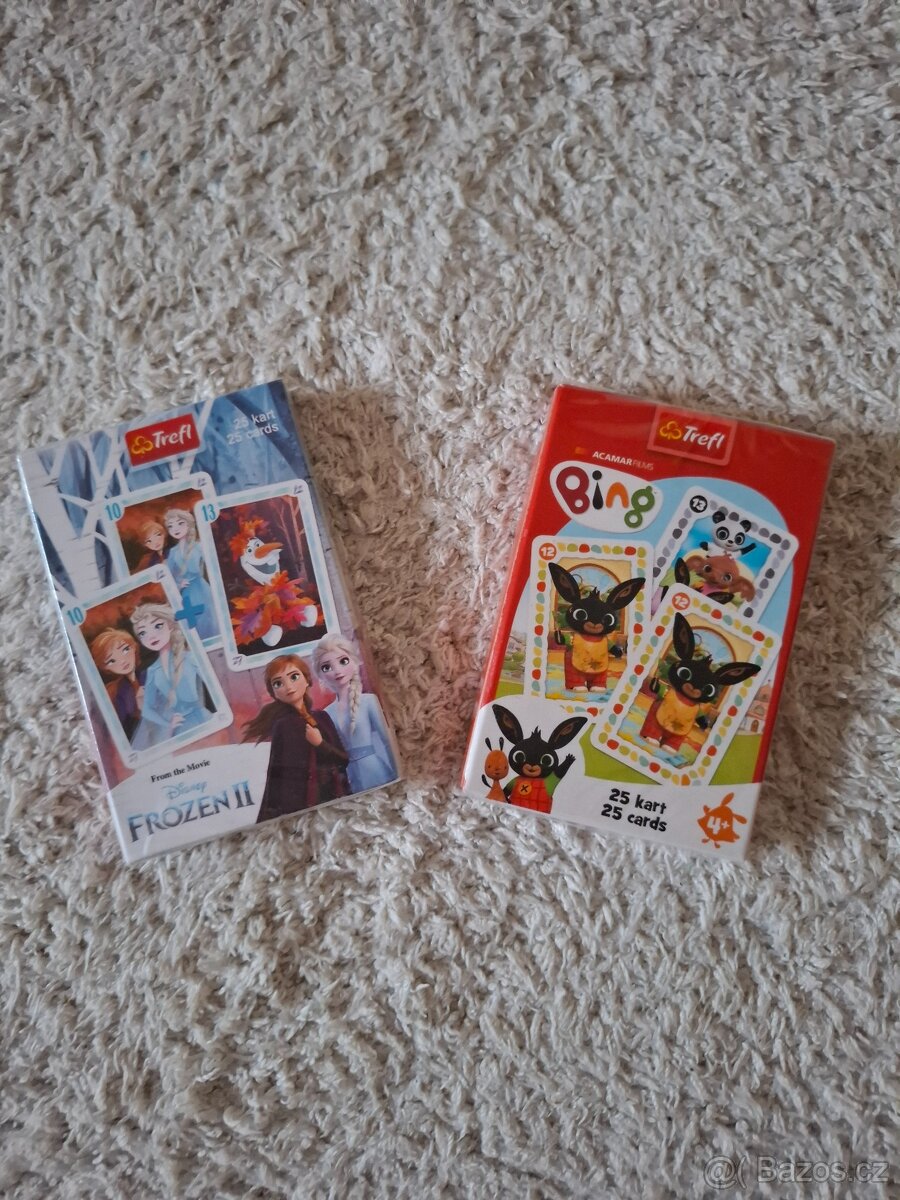 Prodám nové karty Černého Petra s motivem Bing a Frozen II v papírové krabičce značky Trefl. Balení obsahuje vždy 25 karet.