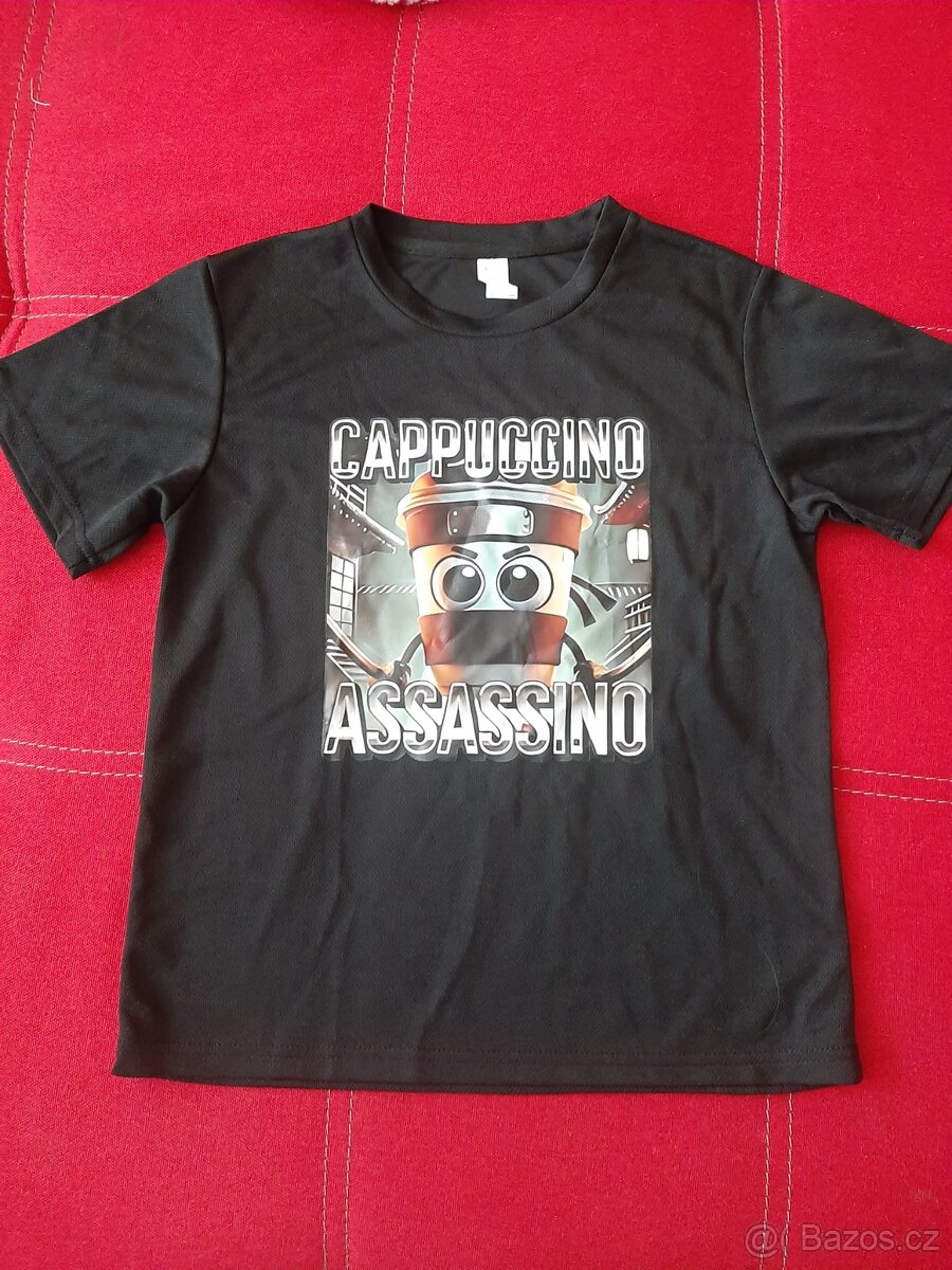 Prodám nové dětské tričko Capuccino Assassino. Černá barva. Barvy obrázku jsou ve skutecnosti sýtější. Velikost na 9-10 let. Rozměr ramena 35 cm, hruď 42 cm, délka 55 cm, Cena 59 Kč. Můžu poslat jako obyčejné psaní za 40 Kč.
