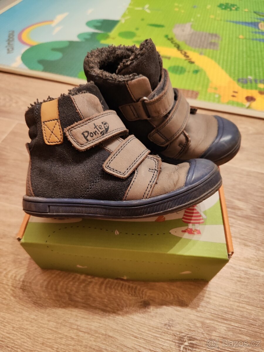 Prodám dětské zimní kožené boty PONTE (D.D.step) vel. 27 ve velmi pěkném stavu. Botičky jsou krásně teplé a ohebné, kožíšek uvnitř celé boty i na stélce. Zapínání na suché zipy, vhodné pro vysoký nárt, jsou pěkně široké s kulatou špičkou, takže nožičky se v nich netísní. Délka stélky cca 17 cm, šířka stélky cca 6,5 cm (měřeno v nejširším místě).