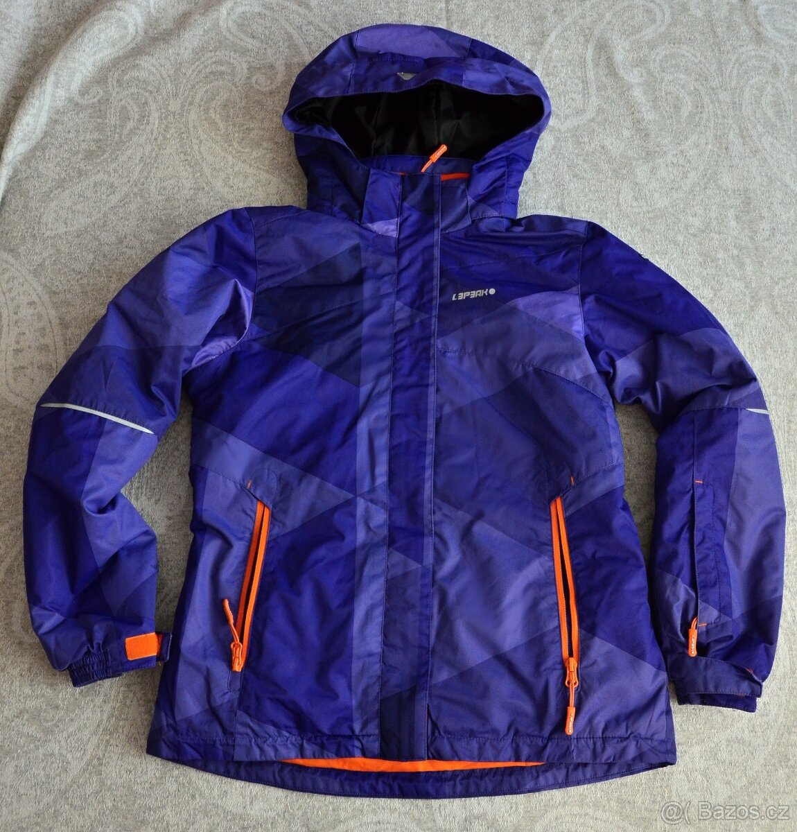 Dívčí lyžařská bunda, kombinace fialová s oranžovou, v perfektním stavu. Velikost 11-12 let. Rozměry: Délka 60cm, šířka 45cm, délka rukávu od ramene 56cm.
