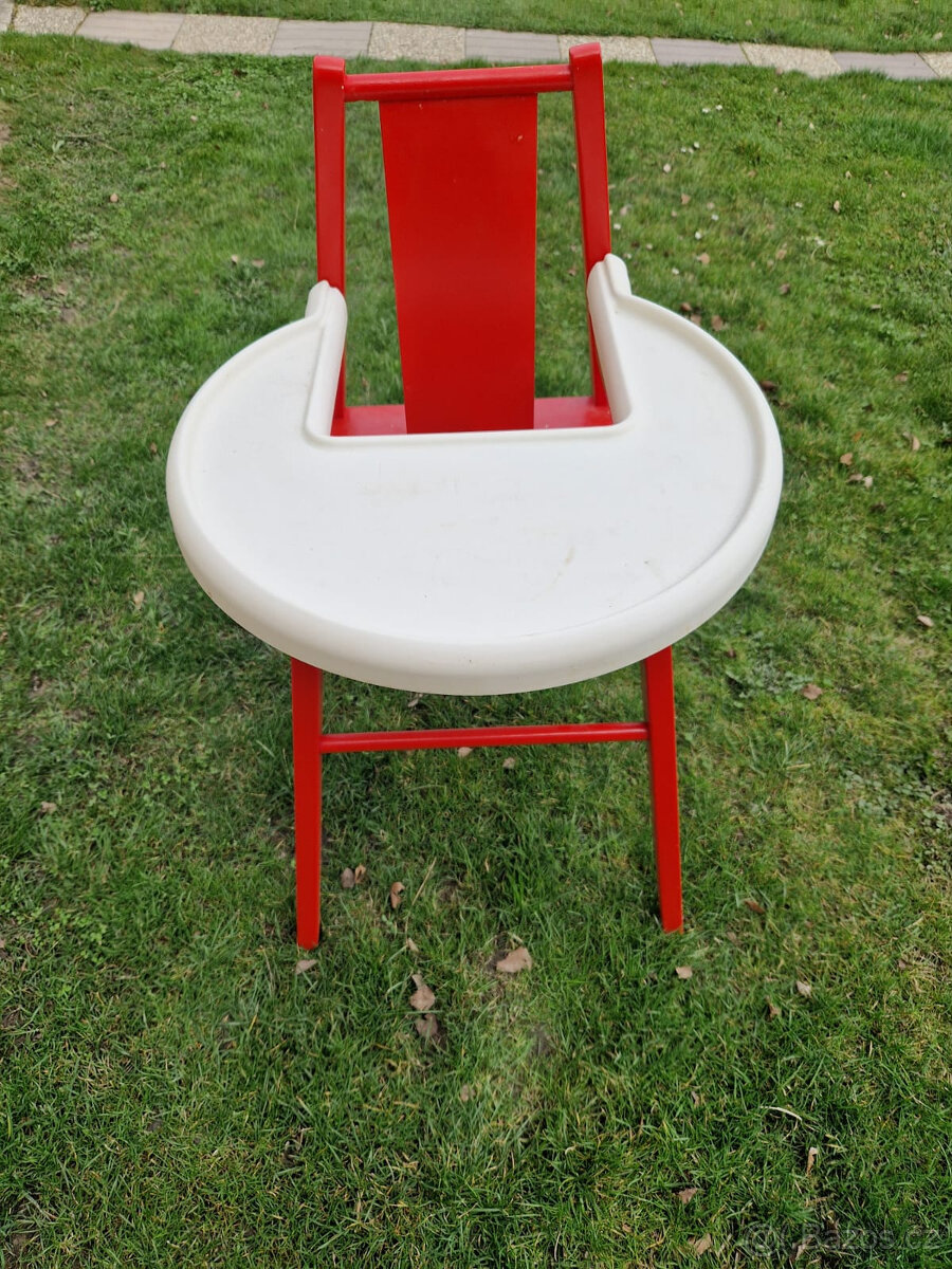 Detska drevena zidlicka - jidelni krmici zidle pro dite. Drevena s plastoym pultem. Celkova vyska 93cm.Tribodovy pas.
