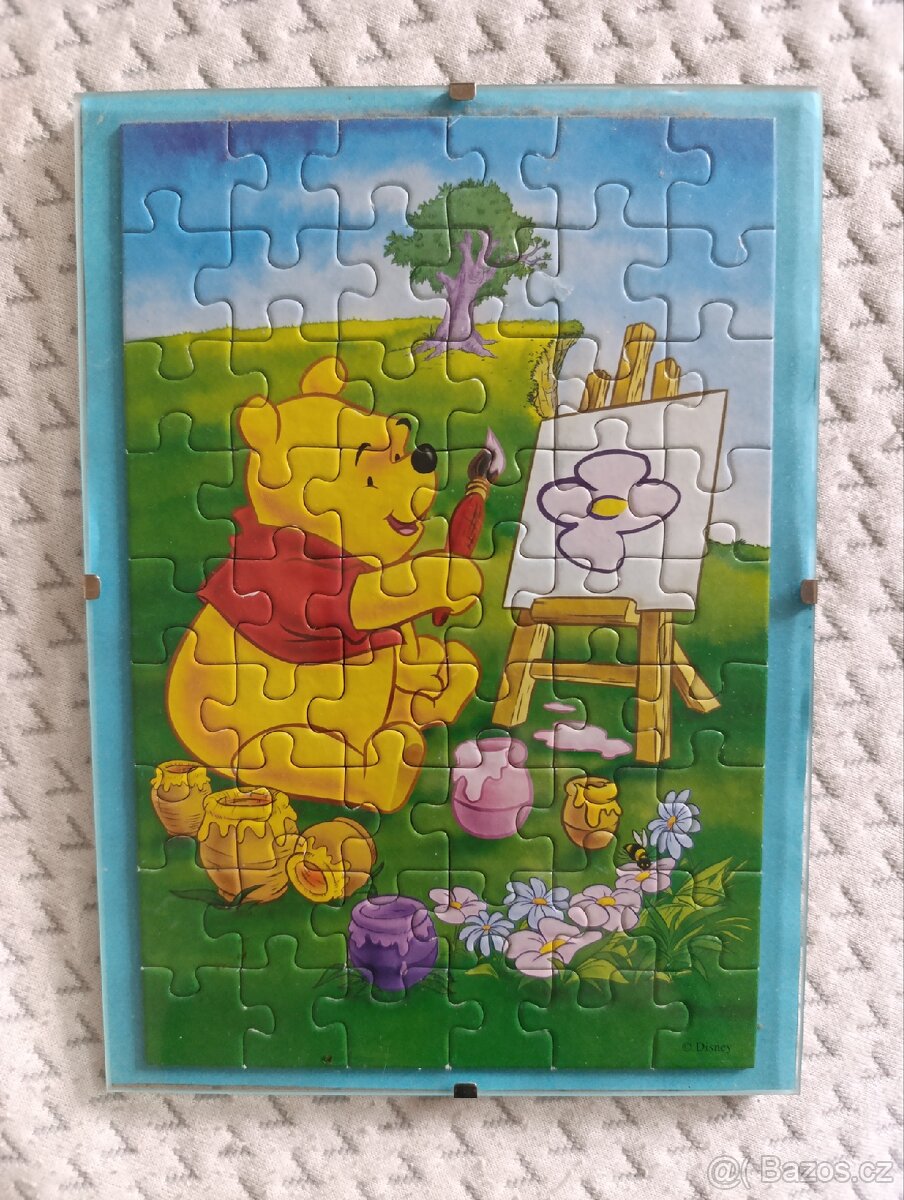 Puzzle Medvídek Pú pod sklem. Puzzle tygr v dřevěném rámu, a vyšívaný obrázek.