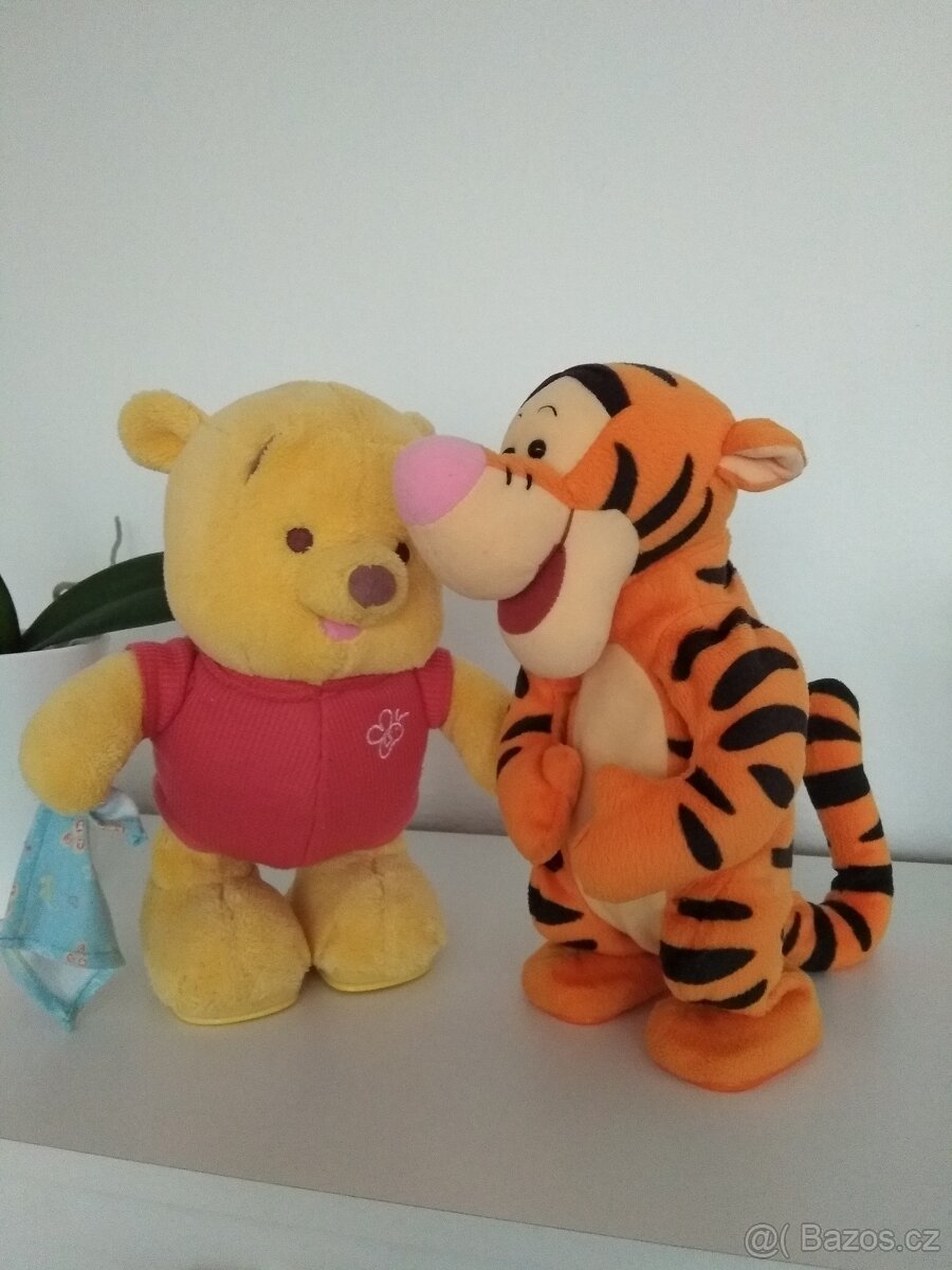 Prodám postavičky Medvídka Pú a Tygříka. Pevné tělíčka. Nefunkční. Možná šikovný tatínek opraví. Chodili a mluvili. Na tužkové baterie. Vypadají jako opravdoví. Výška 30 cm. Cena za oba
