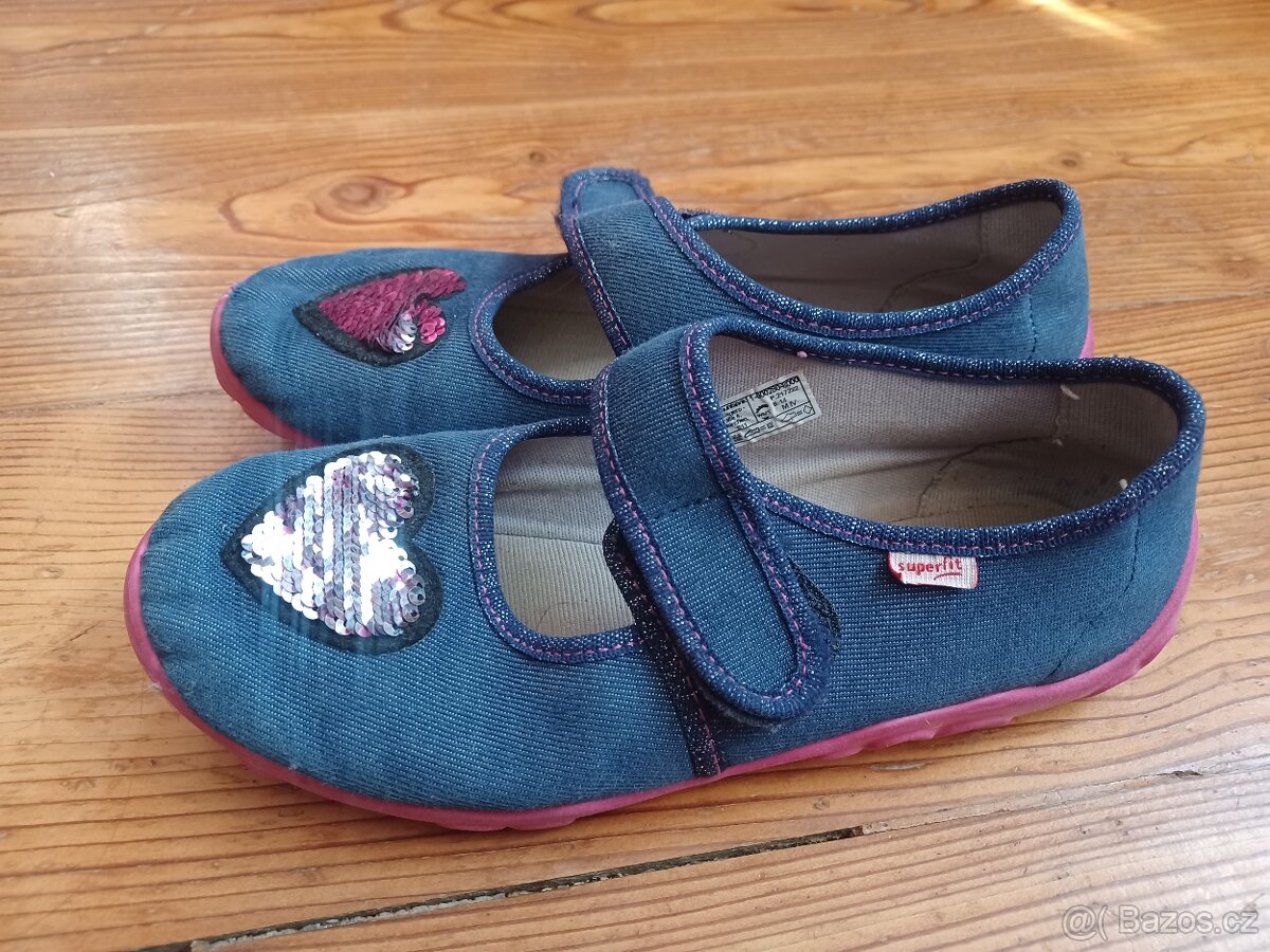 Bačkory, papuče Superfit 36, z džínoviny s aplikací srdce. Suché zipy čisté, na špičce prave boty malá dírka, vše viz foto. Jsou opravdu krásné.