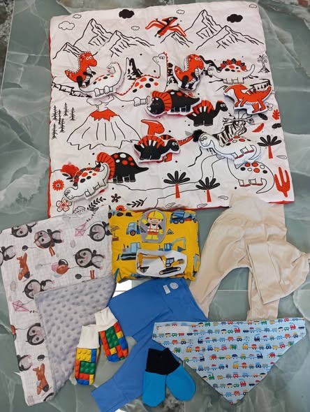 Velká mega výprodejova sada pro chlapečka, k dece spousta věcí zdarma! Cena celé sady je 1100,- a sada obsahuje.. hrací deku 80cm, tepláčky 2x vel. 68/74,2x rukavičky 6-12 měsícu, šátek na krk uni 0-4roky, polštářek aktivit, dečka na muchlani do kočárku