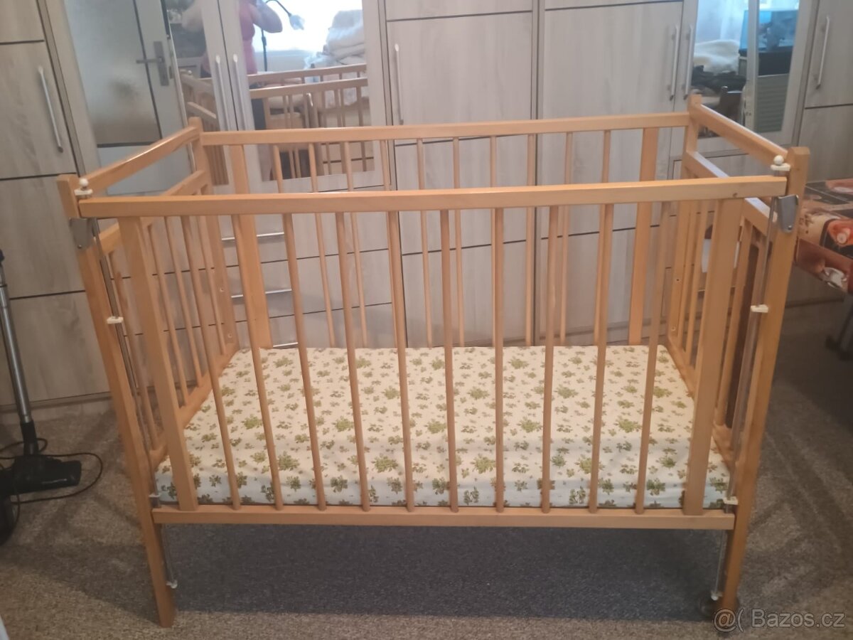 Prodám dětskou postýlkou s kolečky a s matrací. Nikdy nepočůraná. Jako nové. Jen OSOBNÍ PŘEDÁNÍ - Chocerady, Sázava, Praha 4 (po domluvě).