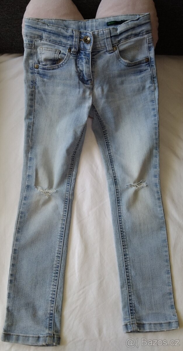 Prodám dívčí džíny Benetton vel. 128. Délka 73 cm., délka od rozkroku 55 cm., šířka v pase 32 cm, regulace v pase. Cena 60 Kč.