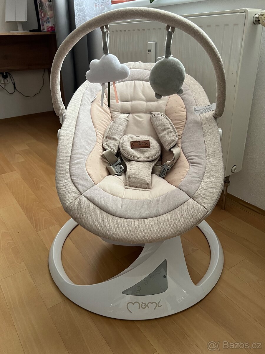 Prémiové houpátko MoMi PEARL s otočným sedátkem, dvěma režimy houpání, hudbou, Bluetooth a dálkovým ovládáním. Pro miminka od narození do 9 kg. Noví max. 3 krát použití. Koupili