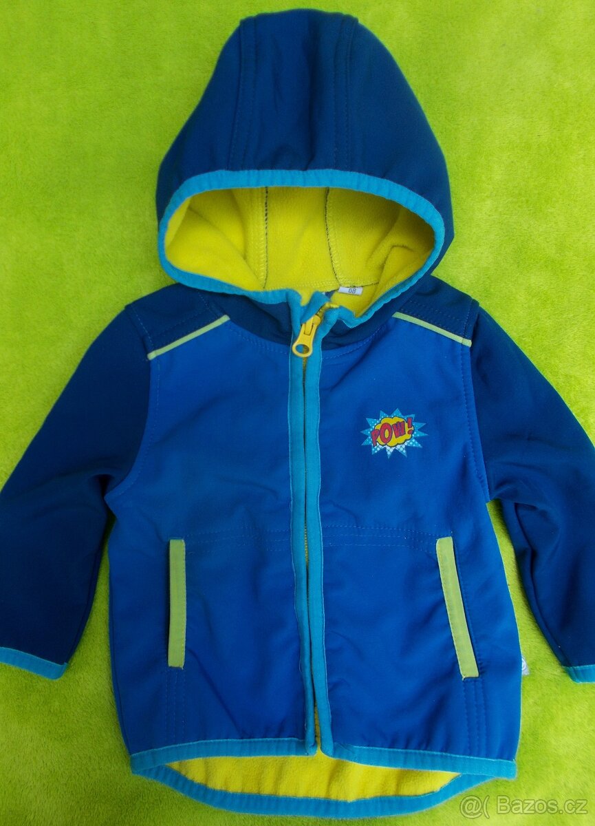 Pěkná jarní softshellová bunda - modrá se žlutými detaily. Zapínání na zip (u krku ochrana bradičky), dvě kapsičky. Zadní díl delší a dokulata, aby netáhlo na zádíčka.