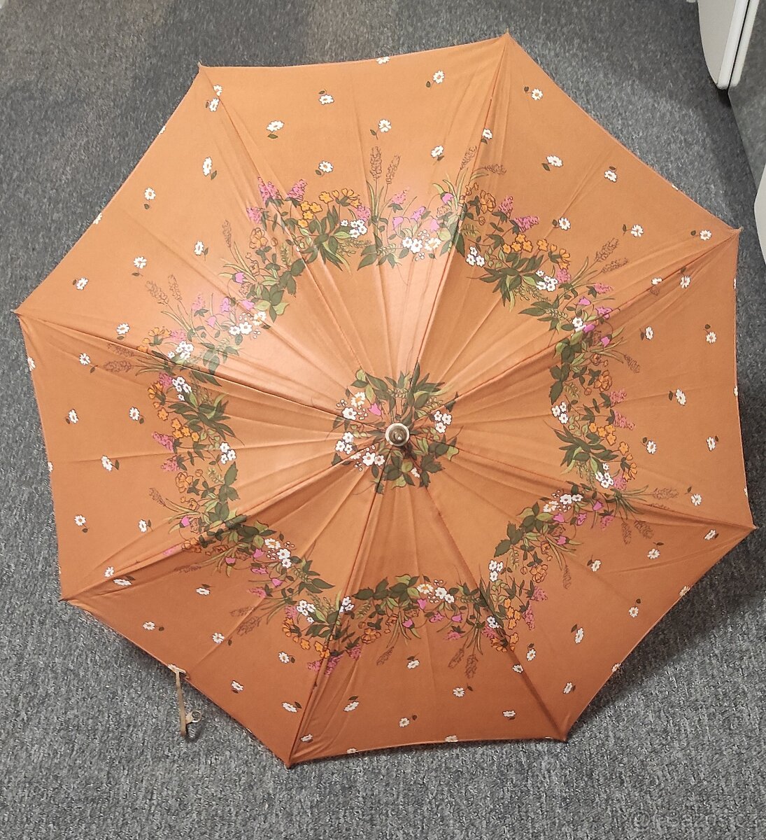 krásný retro dívčí deštník s květinovým vzorem na pískově hnědém podkladu, kovová konstrukce, dřevěné madlo, celková délka složeného deštníku je 56 cm, otevřený deštník má poloměr 42 cm, včetně pouzdra